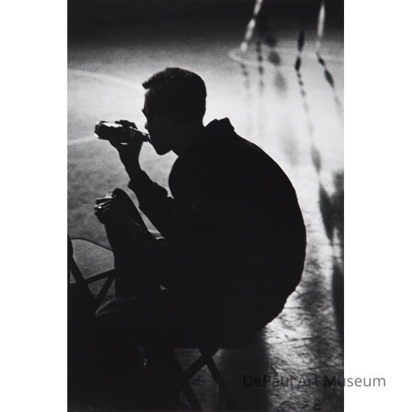 A silhouette of a man with a curved back drinking out of a bottle.Acquisition