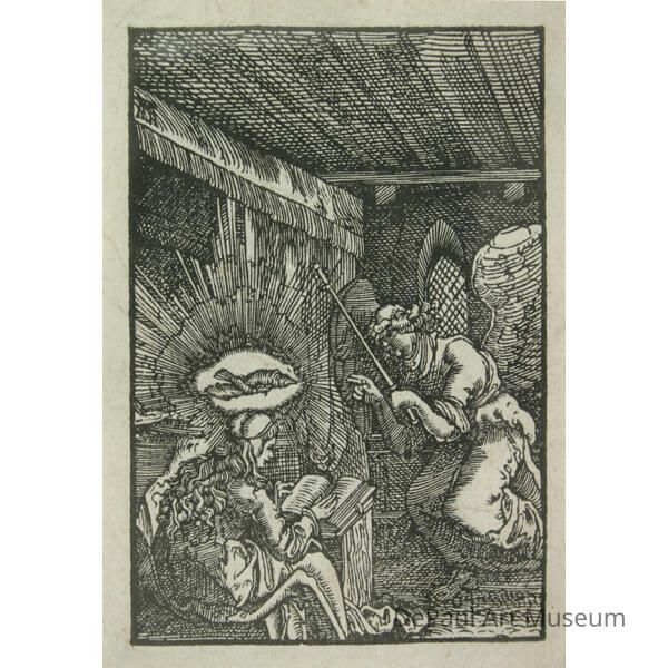 Typical Annunciation scene where Gabriel, CR, comes to Mary, BL, (who sits, back to viewer, with an open book) to tell her of the Immaculate Conception.Acquisition