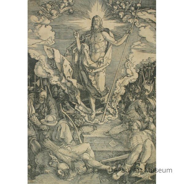 Image of a triumphant Christ standing with a blessing gesture (ad locutio) over fallen soldiers, with several putti circling overhead.Acquisition