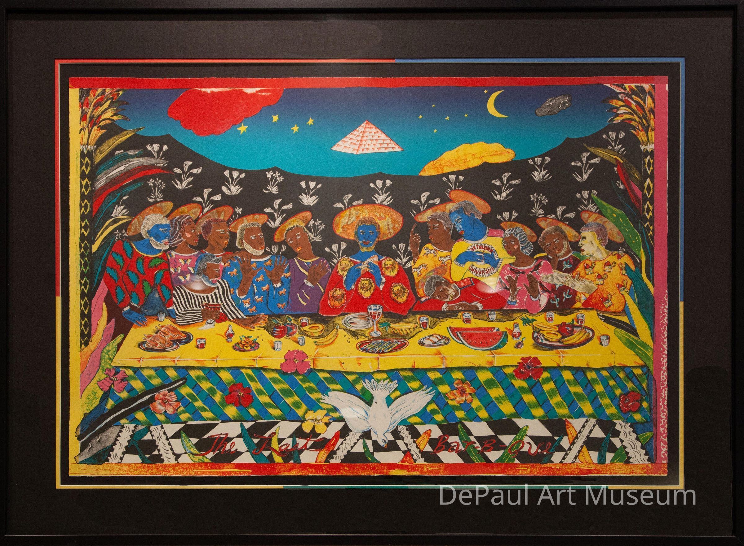 A ten-color lithograph depicting a contemporary "Last Supper." The foreground has a table set with vivid colors. 11 people sit around the table, eating barbecue. Three of the figures are depicted in blue. The background depicts a pyramid, the night sky, and a field of crops.Context