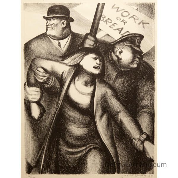 A woman is being restrained by two men and a sign in the background reads "Work of Bread."