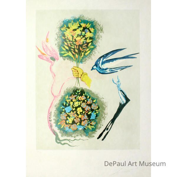 abstracted flowers, a bird, a female figure and a butterfly.Artwork Details