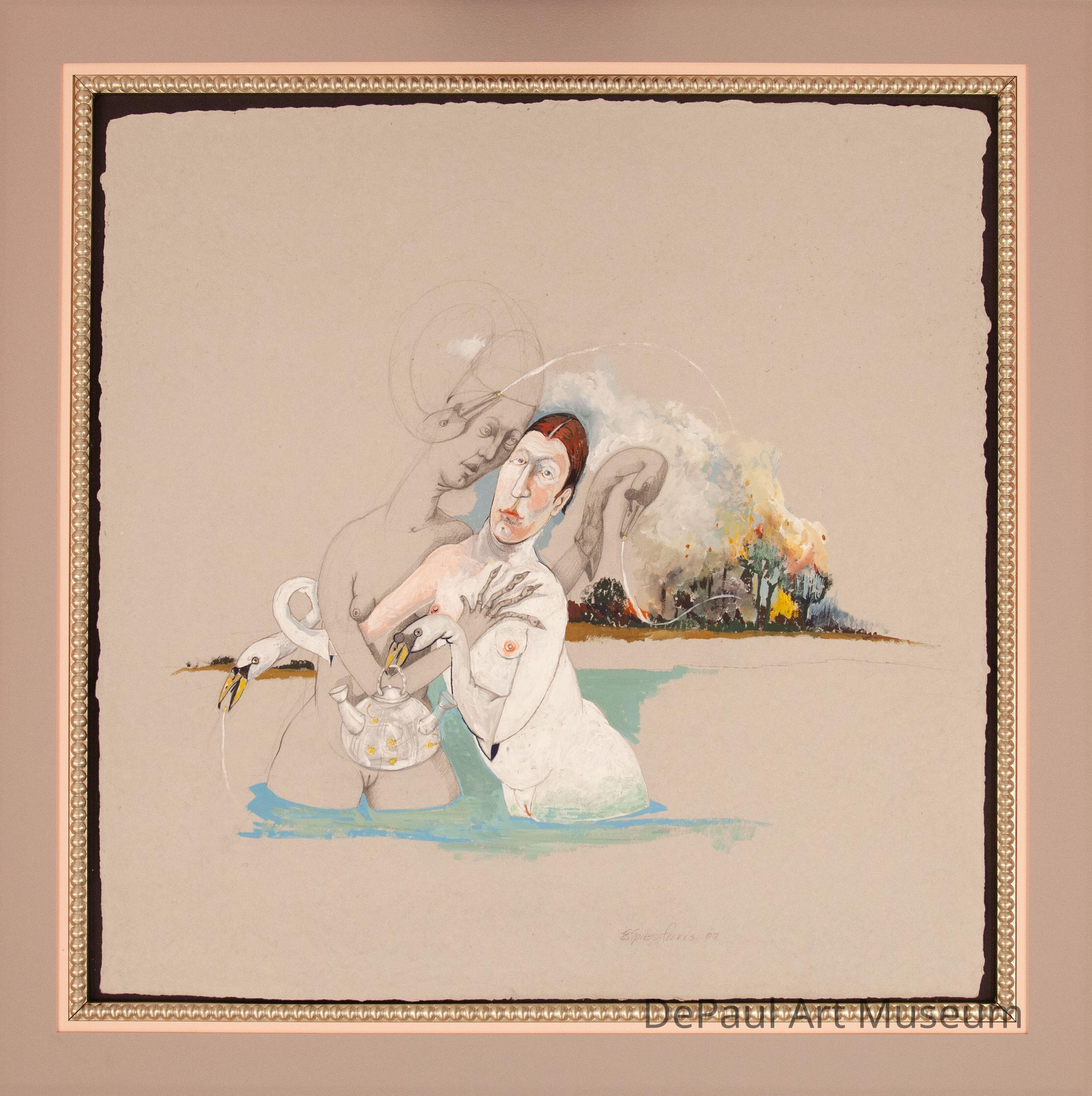 The women is Spiess-Ferris’s works often take on the personas of goddesses, either in the spiritual or natural worlds. They are multifaceted and slippery depictions that teeter on the edge of powerful and vulnerable, naïve and sly. The swans found throughout The Tea Pot composition are a regular motif in her works. For the artist, the multiple dimensions and personifications of swans throughout Western histories makes them a nice companion animal to compare and contrast with the multifarious ways that Western histories depict women. In addition, Spiess-Ferris’s upbringing in rural New Mexico taught her the importance of nature and one’s connection to it. Therefore, throughout her works, the direct connection of women to nature and the preservation of the natural world through the work and power of woman is pervasive.Acquisition