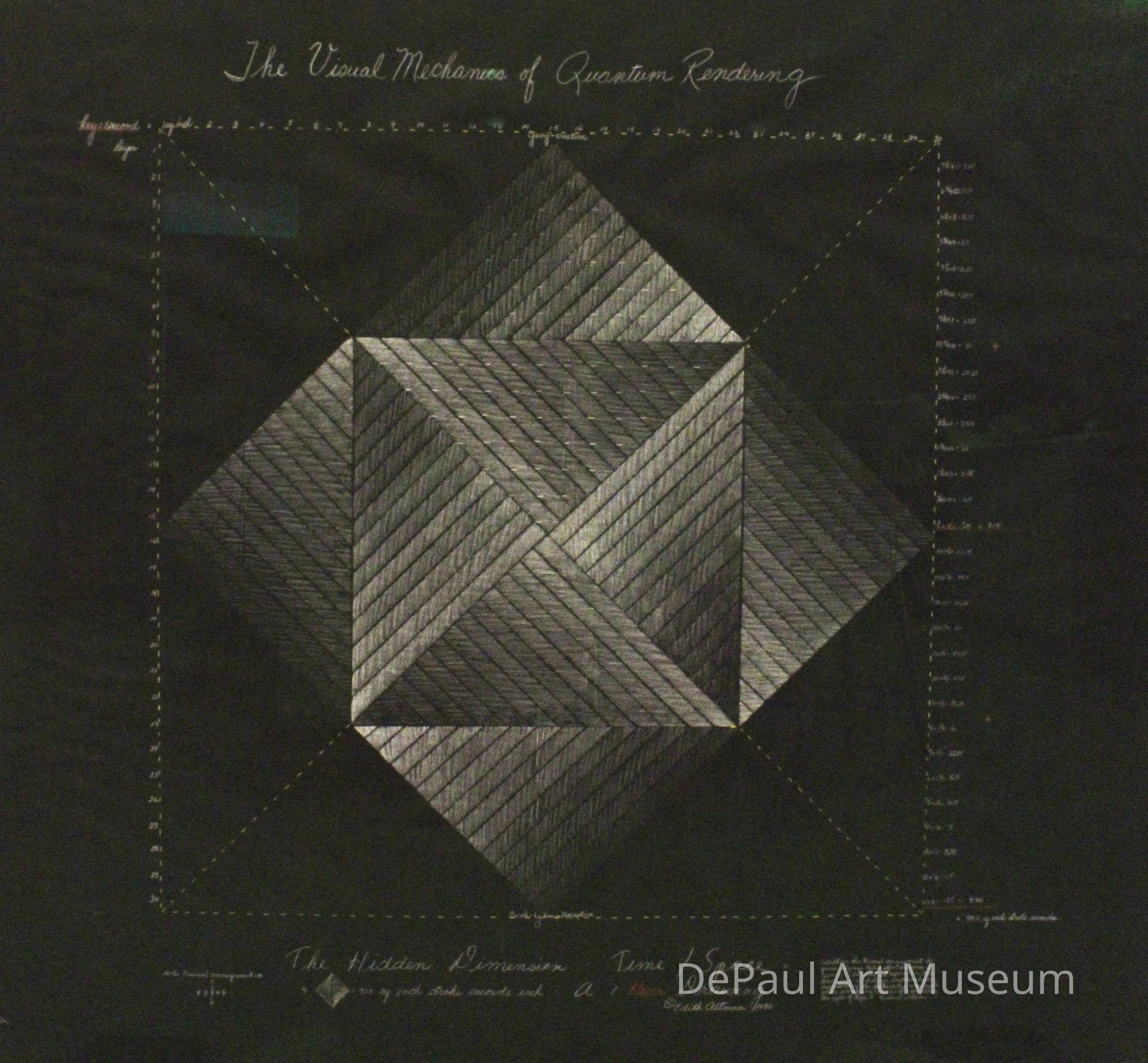 The Visual Mechanics of Quantum Rendering (1980) is part of a larger installation titled Time/Space: The Hidden Dimension which included nine similar drawings, all dominated by a strong conceptual framework that involves the exploration of time and her connection to its passage in space. In The Visual Mechanics of Quantum Rendering, Altman creates visual and spatial representations of time by using quarter, half, and full hour intervals, along with their subdivisions, on a grid where each square inch represents one second. She begins with a gridded square or triangle and paces her strokes at one per second, verifying both a specific duration of time and its corresponding spatial measurement. Altman’s interest in the Kabbalah (Jewish mysticism) informed pieces like this one, and its focus on how we access the present moment.Acquisition