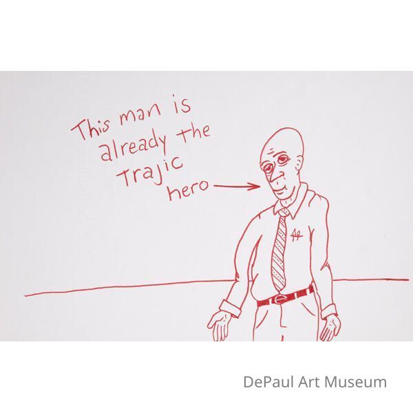 Red ink drawing of a person wearing a shirt and tie with the words "This man is already the trajic hero" and an arrow pointing to the man.Acquisition