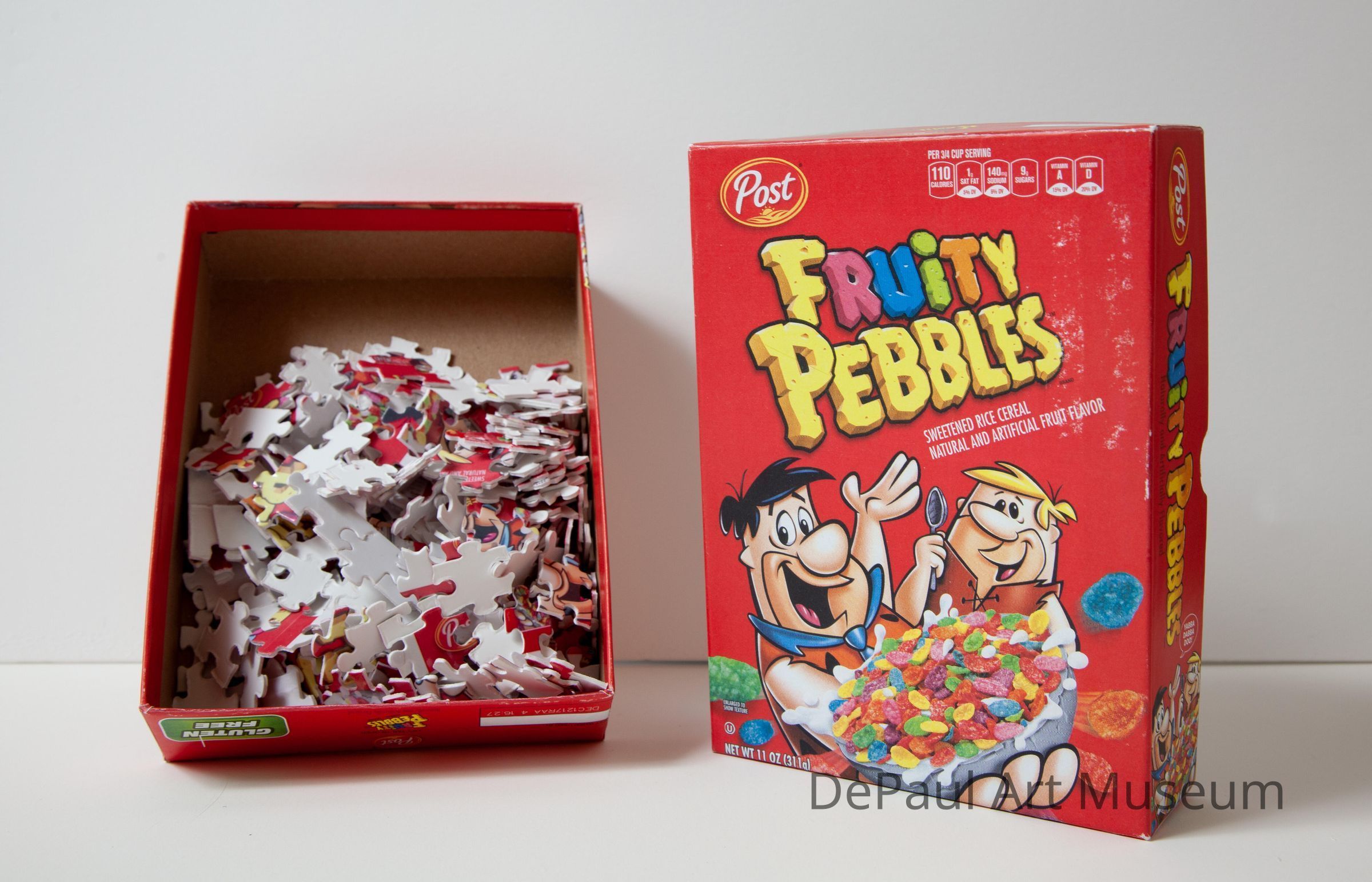 Fruity Pubbles cereal box design on a small, handmade puzzle box, with 252 jigsaw puzzle pieces inside.Context