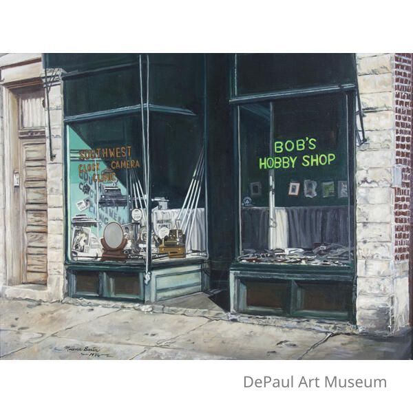 In Two O’Clock Sunday Afternoon, a work made towards the end of her career, the influence of the urban realist school of painting can still be seen in the deep vibrant greens of the store front and signage in its windows. While the work maintains a strong adherence to representational values the loose and expressive qualities of the brushstrokes give room for Barton to express a sense of subjectivity in the experience of her milieu. Similarly to her Urban Realist educators Barton infuses the everyday with a sense of subjectivity and bold strokes of color which draw the eye inwards towards the store front’s alcove with the contrasting uses of electric green and reds. Moreover, the vantage point is situated at a skewed angle where we can clearly feel the presence of the artist’s body in the space that she is depicting. Barton would continue to live and paint in Chicago for the rest of her life.Acquisition