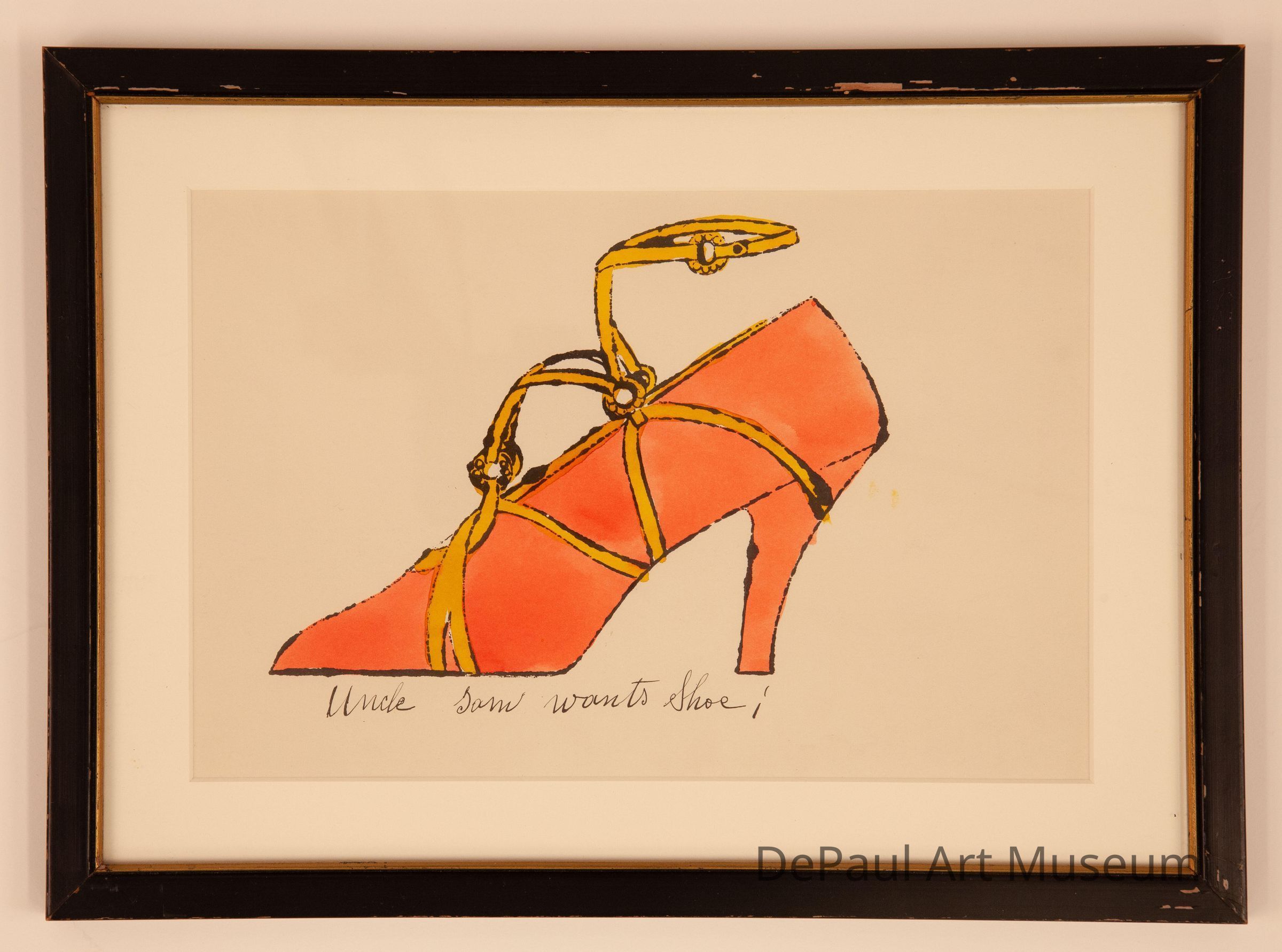 Orange heeled shoe with yellow straps. Under the shoe reads "Uncle Sam Wants Shoe!"