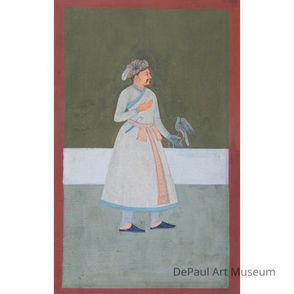 Portrait of an Indian man in traditional garb standing in profile holding a blue bird on a flat green background and red border