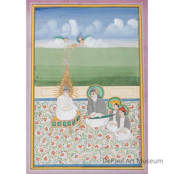 Three people sitting on floral patterned floor in front of an old man on a gold platform