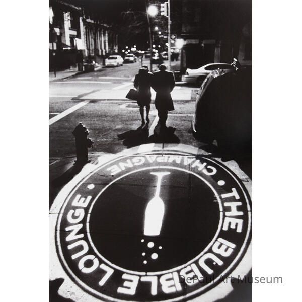 Large circular light emblem projected onto concrete sidewalk reading "The Bubble Lounge - Champagne" at night in black and whiteAcquisition