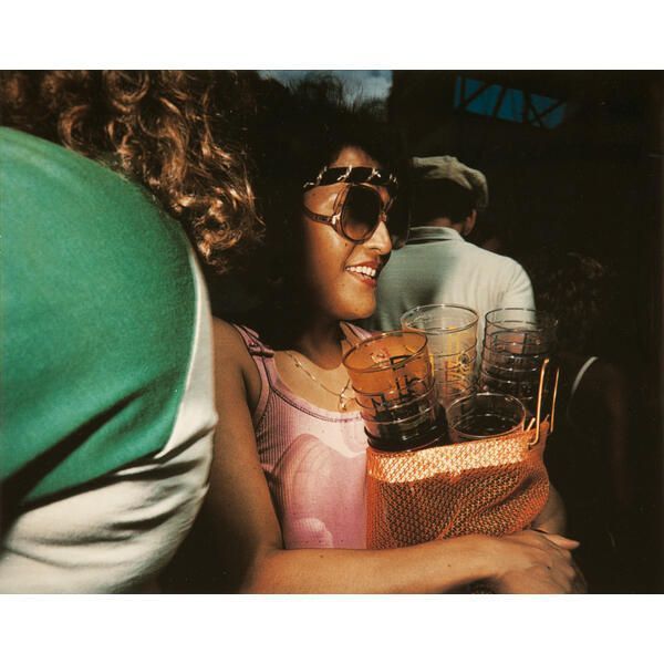 Woman wearing sunglasses and pink shirt carrying a bag of empty glasses.Acquisition