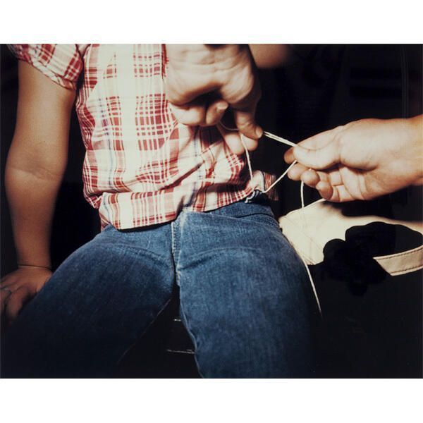 Close-up of man's torso and lower body, seated, wearing red plaid shirt and jeans with hands tying white string on his belt loop.Acquisition