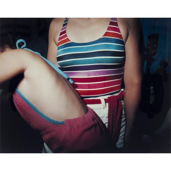 Woman's torso leaning to the left in front of another woman's torso wearing a stripped bathing suit standing straight up.Acquisition