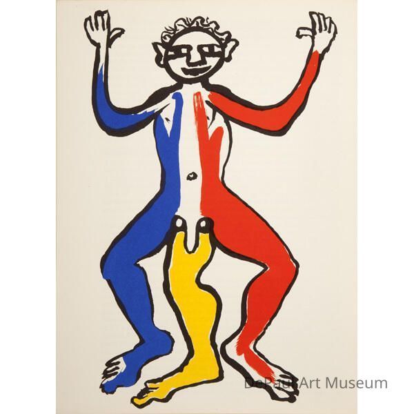 Calder, an artist from an early age, is best known for his creation of the “mobile;” a hanging, kinetic, metal sculpture that relies on balance (named by Marcel Duchamp). In addition to this invention, he also experimented with a wide range of other materials and art forms such as wood carving, painting, drawing, jewelry making, and other metal sculptures. This drawing is typical of his style as it shows his interest in primary colors and cartoonish figures. It was featured in ‘Derrière le Miroir,’ a French art magazine that was published from 1946 until 1982, where Calder had multiple appearances.Acquisition