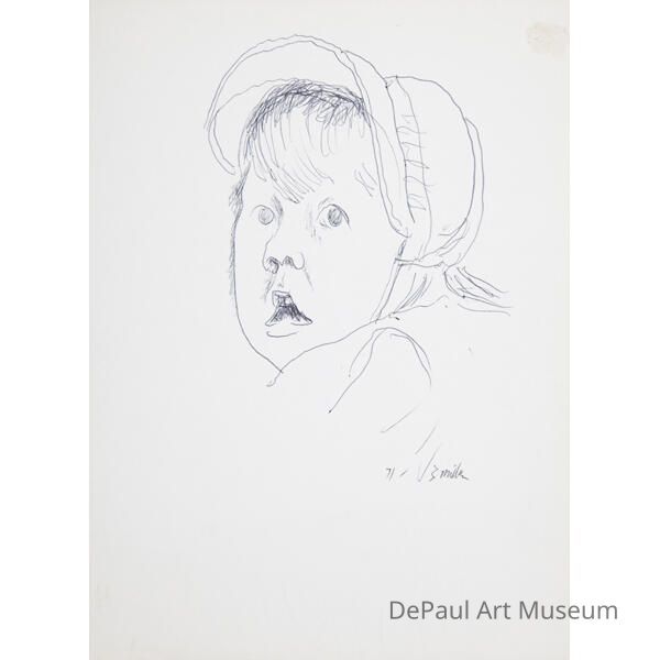 Drawing of wide eyed child wearing a bonnet done in black ink.Acquisition