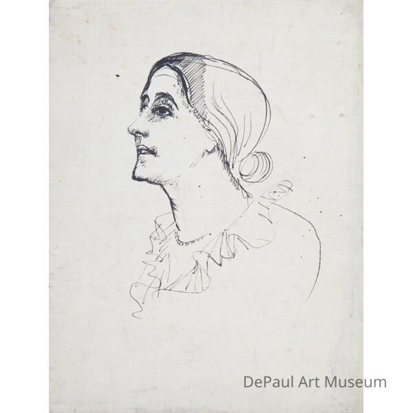 Ink drawn profile of a woman looking up with ruffled collar.Acquisition