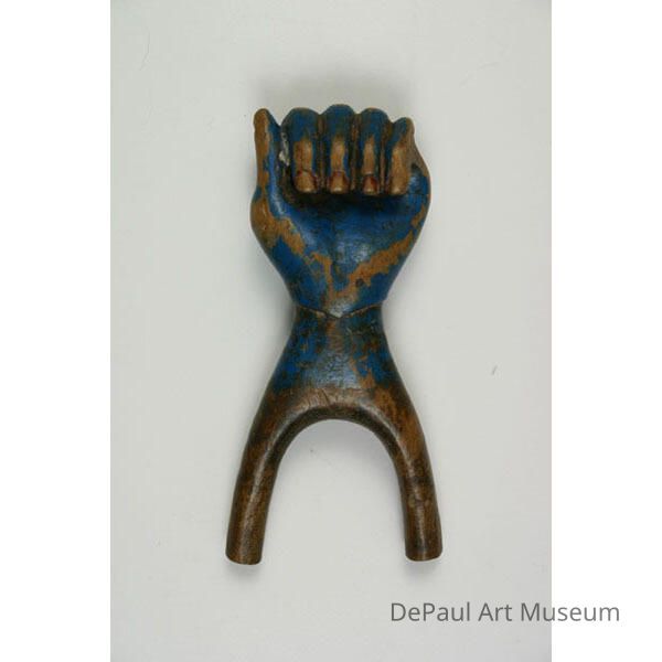 Small slingshot shaped as a closed fist painted blue, with fingernails painted red.Acquisition