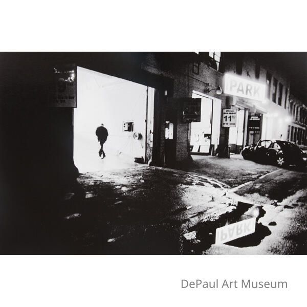 A scene of an alley at night leading into a bright, white parking garage in black and whiteAcquisition