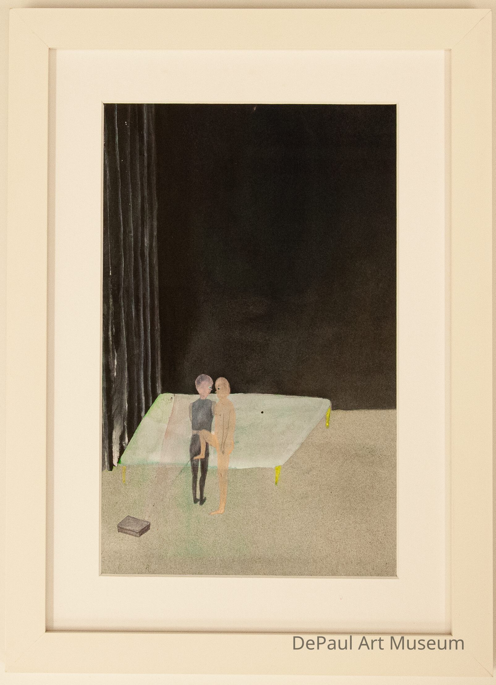 Two figures, one naked, embraced standing next to a bed.Artwork Details