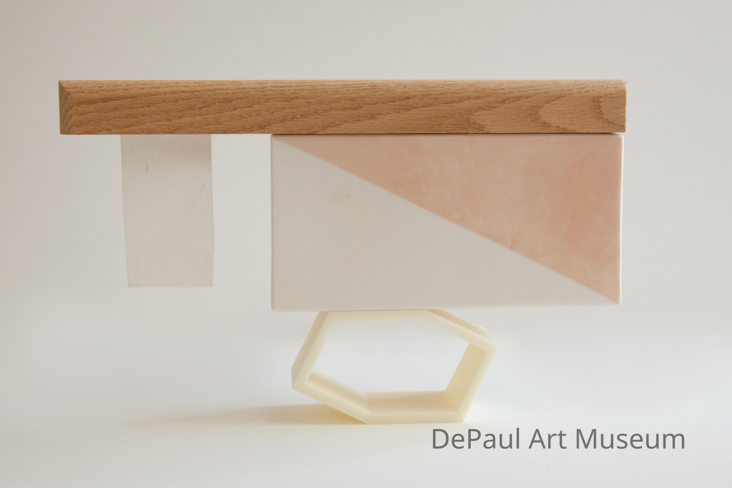 In this piece, one can find wood that resembles a slice of crown molding or perhaps a railing that has been sanded and smoothed. A rectangle of cool matte white porcelain hangs from it, a soft pink triangle of glaze covers one side. A white cotton flag hangs next to the porcelain, which is balanced on an ivory piece of 3D printed plastic. This sculpture uses a design principle known as a steelyard balance to create a sense of harmonious stability. Balance in design is similar to balance in physics. A steelyard balance is a type of scale that incorporates a counterweight. The counterweight slides along the arm of the scale and is used to counterbalance the load and indicate its weight. In this case the large porcelain rectangle is counterbalanced by the small piece of cotton fabric. Imagine a seesaw. The piece of wood is the lever of the seesaw and the ivory plastic ring is its fulcrum. The porcelain rectangle and the cotton fabric are in the wrong place, unexpectedly situated between the lever and the fulcrum. Yet we do not mind them there, the sculpture feels somehow upended and balanced. This is Kongo’s stated goal, to unify opposites, and to investigate tension and balance.Acquisition