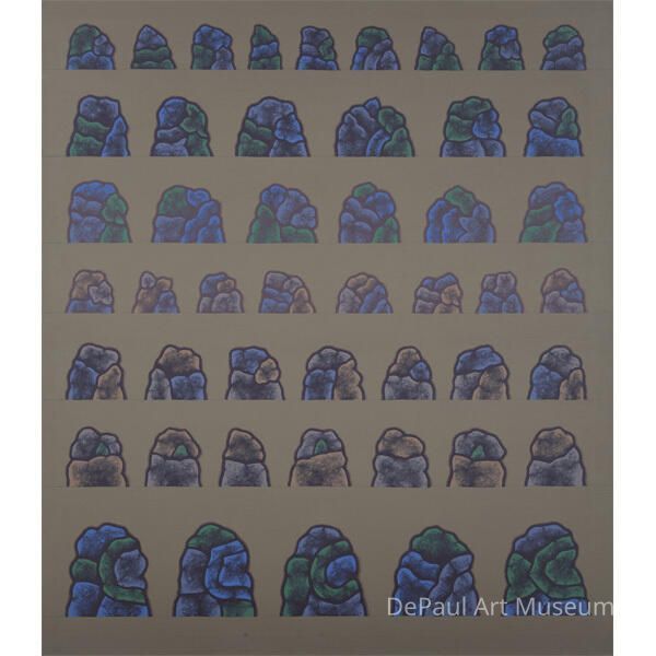 Repeated forms of blue, green, purple, and orange mounds arranged in horizontal bands on muddy brown backgroundAcquisition