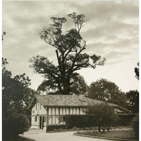 A house with a large dark tree behind it and a cloudy sky