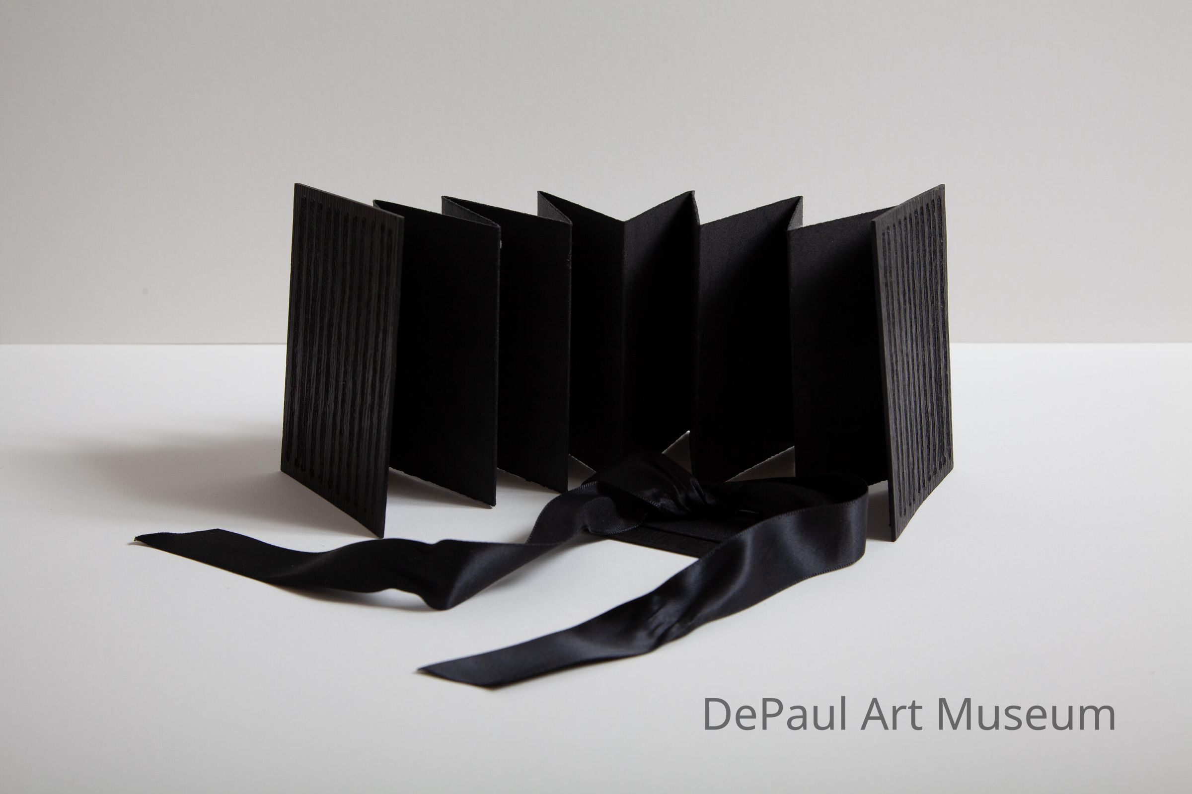 Paper acordion book with front and back cover made of wood. Includes a black ribbon with a small black wood plaque to hold book together when closed.