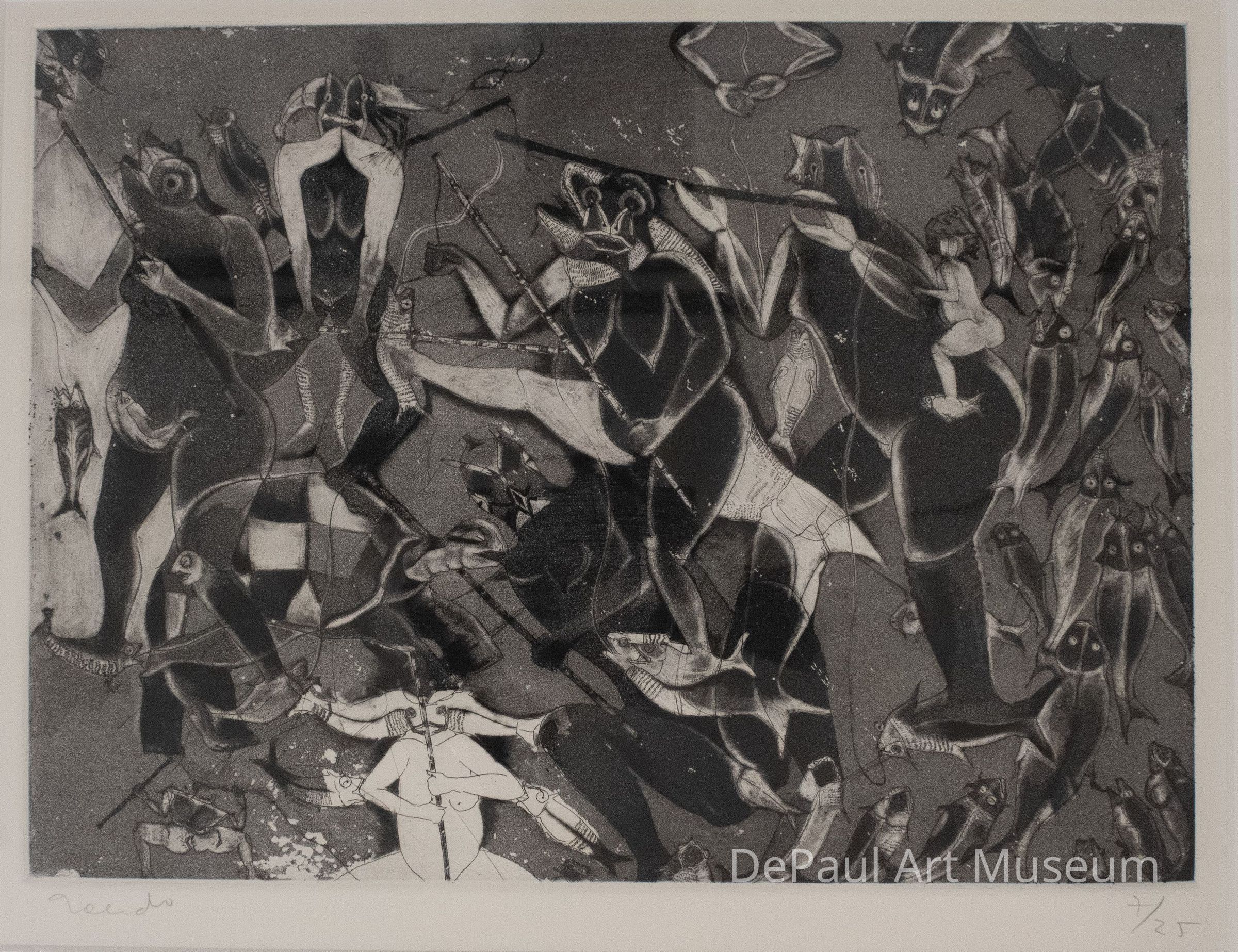 A black and white etching showing various figures holding fishing spears with fish on the ends and around them. Some of the figures have multiple heads or have the head of a fish.Context