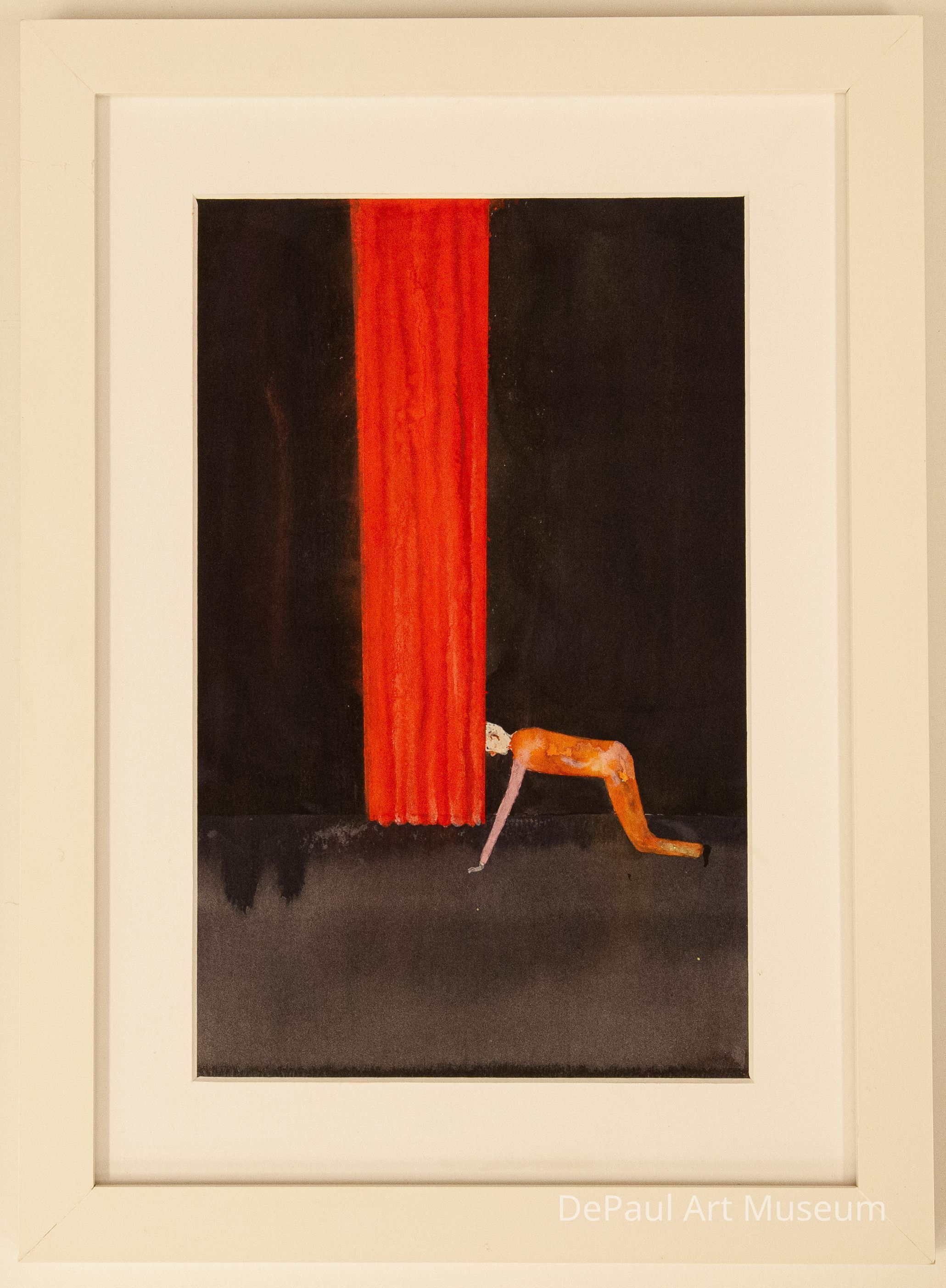 A long red curtain hanging down and a figure on their hands and knees with their head underneath the curtain.Artwork Details