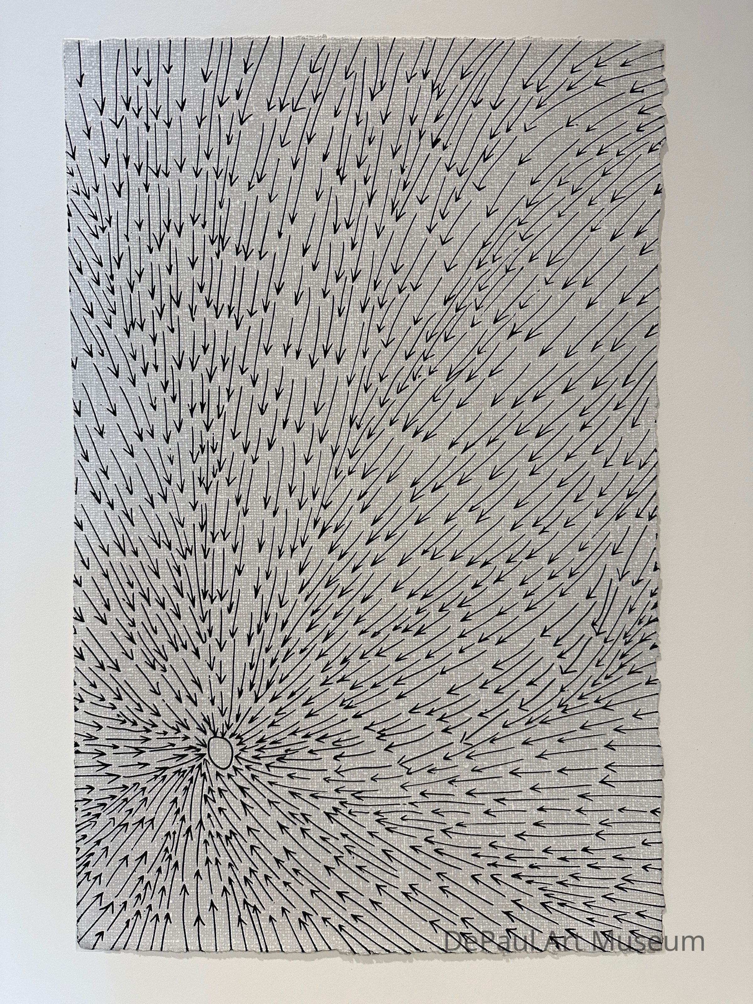 Many lines of arrows pointing to a small circle in the lower left of the paper.