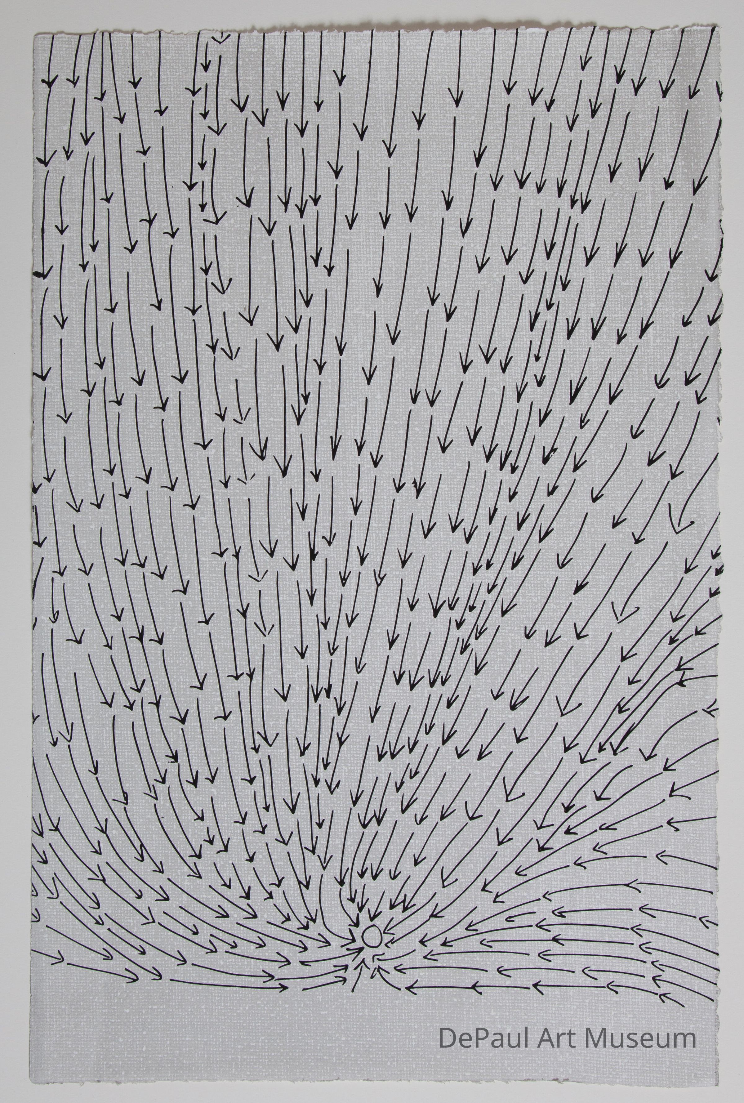Many lines of arrows pointing down to the bottom of the piece to a small circle.