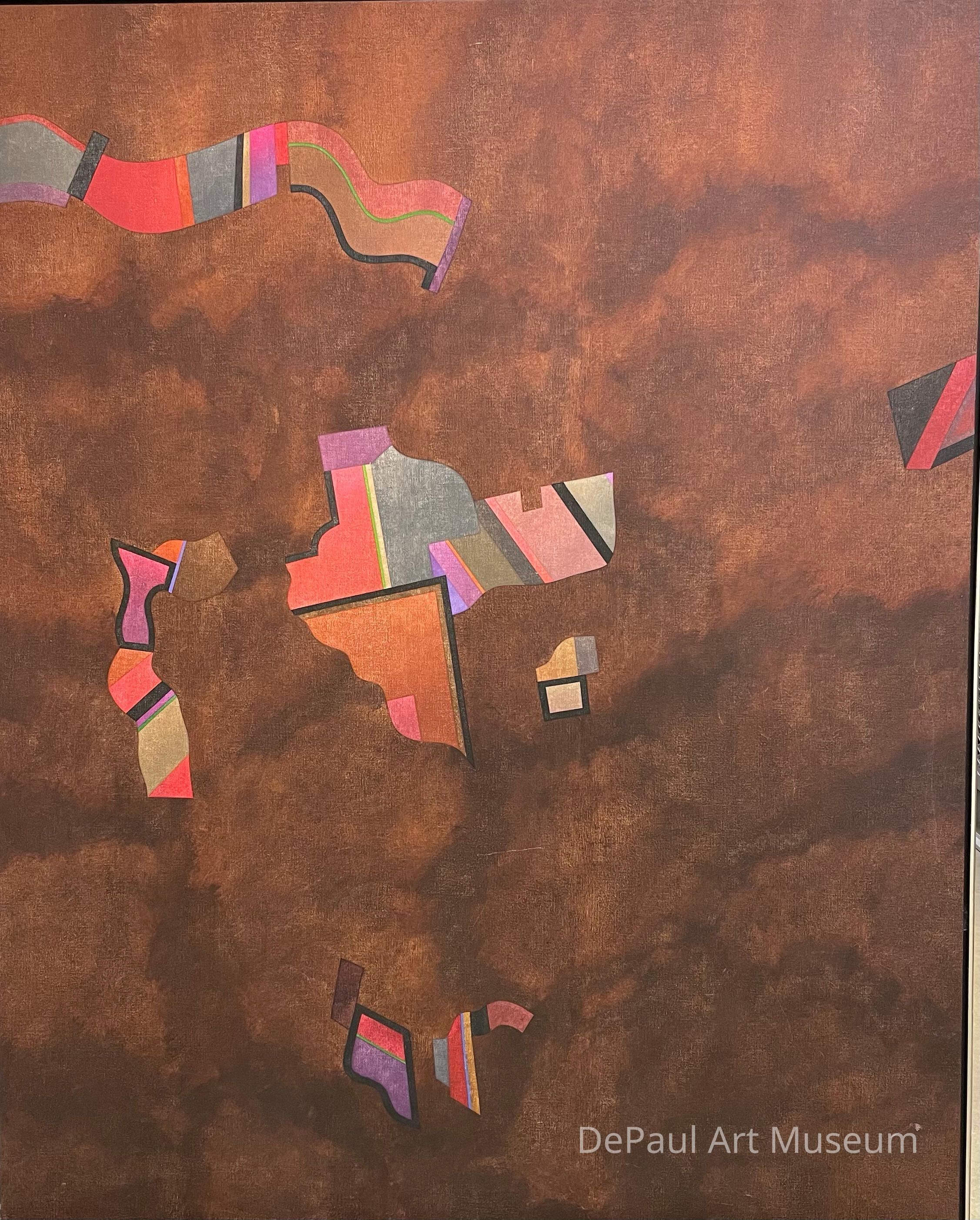 Untitled is demonstrative of a composition technique Ginzel replicated in many works from this period. He used a single dominant colored background upon which colorful shapes are juxtaposed. The forms are neither amorphous nor purely geometric. Instead, the patterned figures nearly appear to be excerpted from another painting and collaged onto the canvas. Ginzel referred to his works as employing “lyrical formalism” and “soft geometry,” which Untitled illustrates through texture and tone.Acquisition