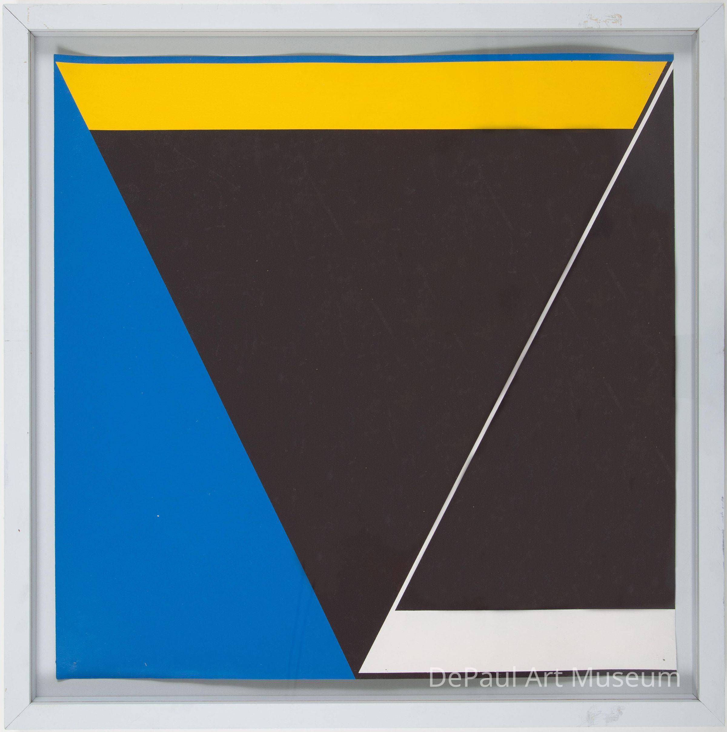 This work is populated by dark black triangles that rest atop pops of bright red, yellow, orange, and what many artists might recognize as “painters tape blue”. These fractured black triangular masses seem as if they are the fragments of a once intact, rectangular whole. Compositionally, Chavira’s work feels balanced, harmonious, not unlike Piet Mondrian, if Mondrian had used diagonals. Both artists favor small square compositions and thin bands of black that stop just short of the edge of the painting. This style marks a departure for Chavira, who has worked primarily in ornate portraiture.Acquisition