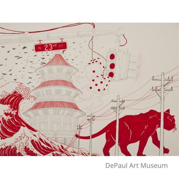 A collage-like combination of a richly decorated Japanese-style pagoda, a wave, a stoplight, a pair of dice, a large felilne, and telephone wire in red, white, and black.Artwork Details