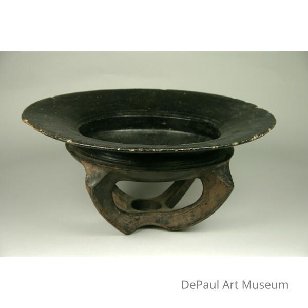 Decorative bowl with four legs that come together underneath. The legs form a small circle that may have been used for a candle to heat the bowl. The bowl is shallow and the rim is chipped throughout.