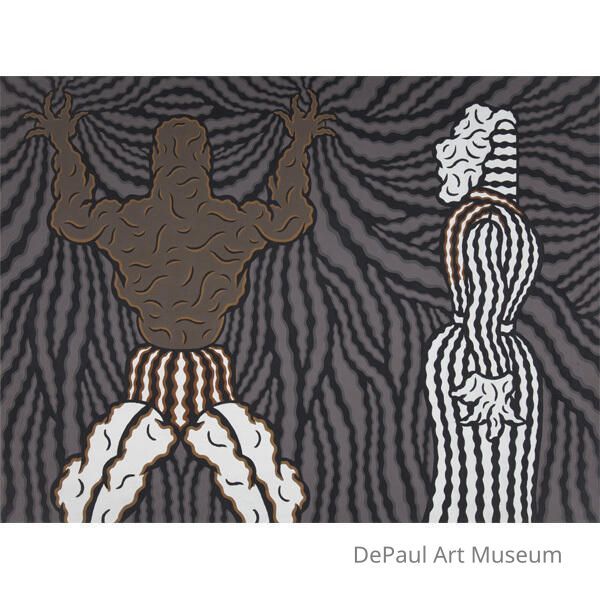 Ray Yoshida’s work is filled with repeating patterns, mysterious imagery, and comic like imagery. His collage like style and dark color palettes created the enigmatic nature of his works and captivated many, including his students some of whom formed the Chicago Imagists. As a teacher at the School of the Art Institute of Chicago, Yoshida’s comic like, patterned imagery influenced a number of his students, Jim Nutt, Roger Brown, and Christina Ramberg to name a few, who birthed a new art movement out of his mentorship. Yoshida’s work ranged from what was called “comic collage” to more figural work as portrayed in this piece. While more figural than many of his other pieces, Untitled (Two Figures) remains an enigmatic and cryptic work that could represent many things including personal turmoil, racial/societal tension, or something entirely different. The ambiguous nature of his work allows for a great deal of viewer interaction and interest. This is all aside from the aesthetic excellence of the piece and the seemingly simple but intricate composition.