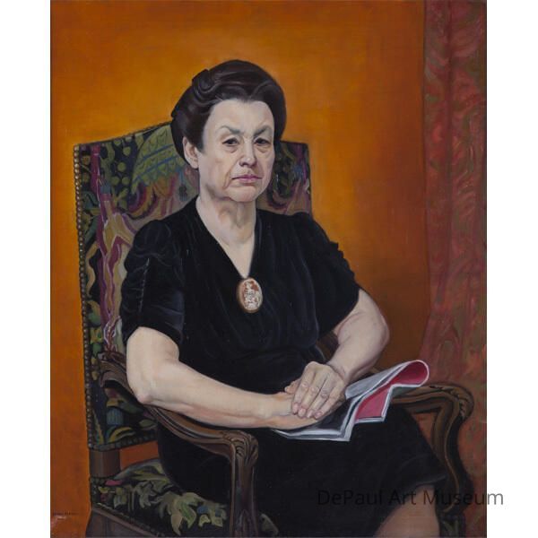 By the 1930’s, Macena Barton was a known name in the Chicago art scene. She became known for her stately portraits painted in robust and vivid colors as well as her space-themed surrealist paintings done later in her career. It is also important to note that many of her paintings hold a strong feminist tone. Chicago art critics wrote in high regards about Barton, which certainly elevated her status but never stabilized her career financially. In 1931, critic Eleanor Jewett named Barton “the most surprisingly dynamic young painter in Chicago” (Chicago Daily Tribune). In a 1941 letter, C.J. Bulliet urged Illinois governor Dwight H. Green to choose Barton as his portrait painter, comparing her to the “old masters” and asserting that “her portraits are as interesting to onlookers who are unacquainted with the sitter as they are to his friends” (Smithsonian Archives of American Art). The portrait shown here, of Barton’s mother, is typical of her work as it displays rich colors and defined, intense features.Acquisition