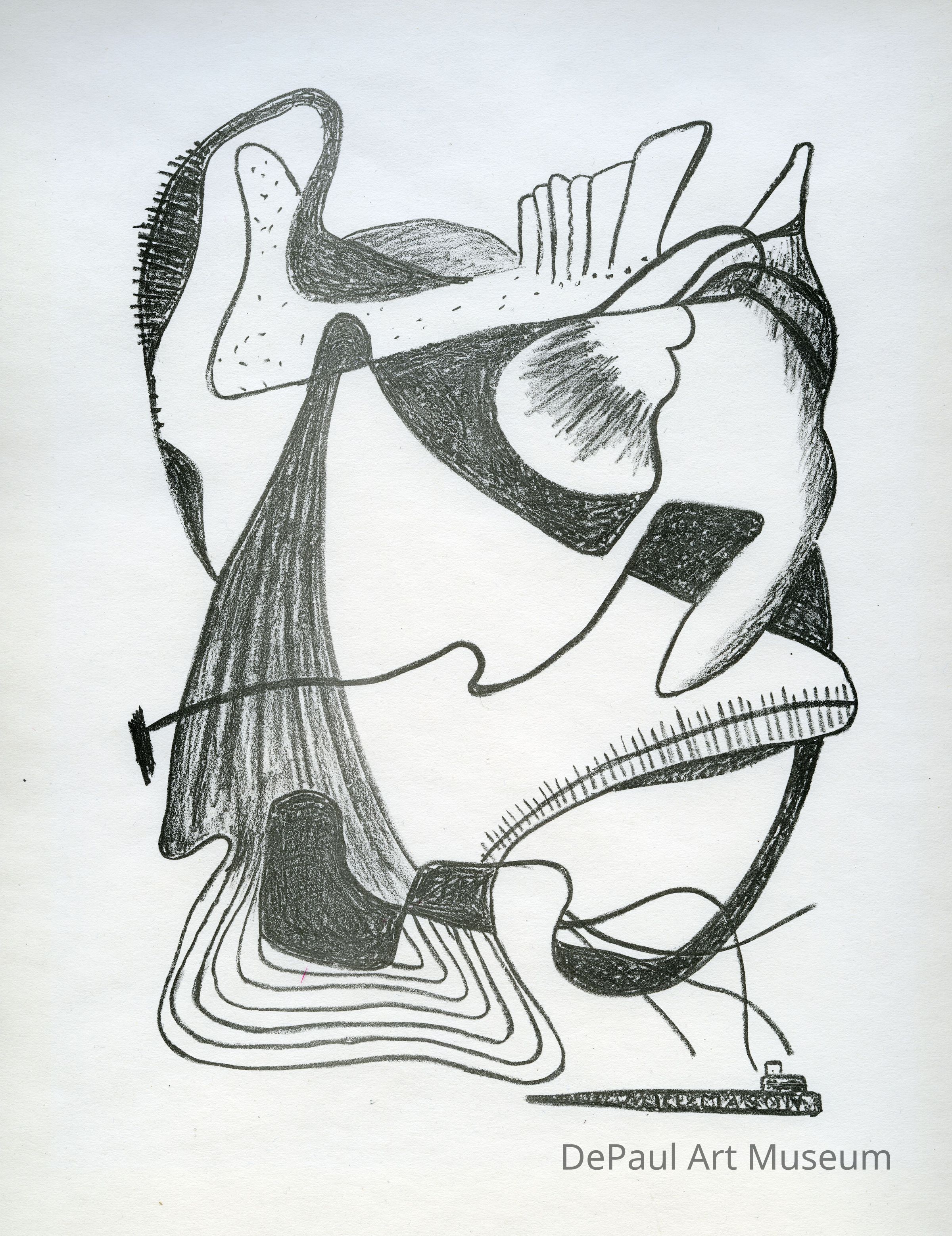 Abstracted curvilinear forms in thick, smudged line which play on use of positive and negative space; repetition wavy lines and slender oval formsArtwork Details