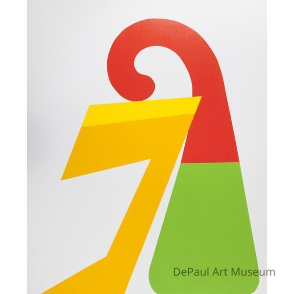 Vertical curving figure, green on bottom and red on top, beside angular, upside-down orange L-shape with yellow band on top.Acquisition
