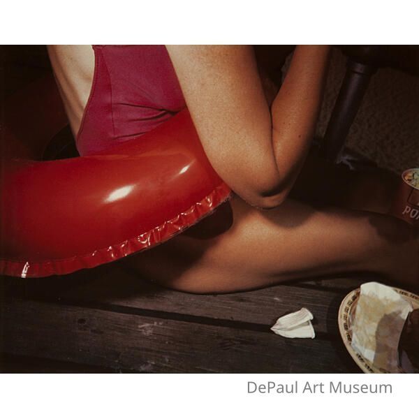 Torso of a woman wearing a pink bathing suit and red inflatable swimming ring.Acquisition
