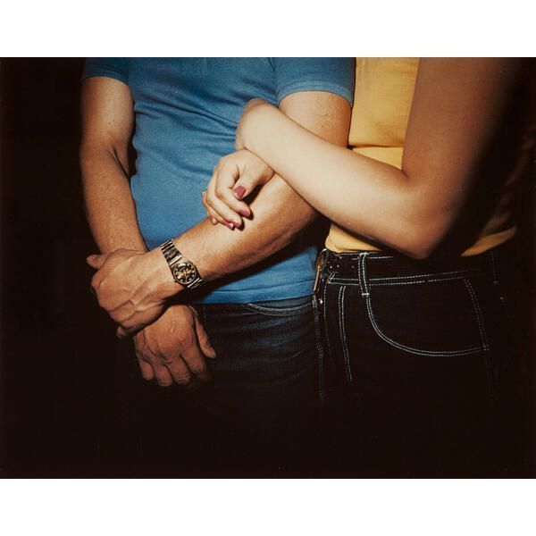 Torsos of two white people, a man and a woman, wearing blue and yellow shirts respectively, with the woman wrapping her arm around the man.Acquisition