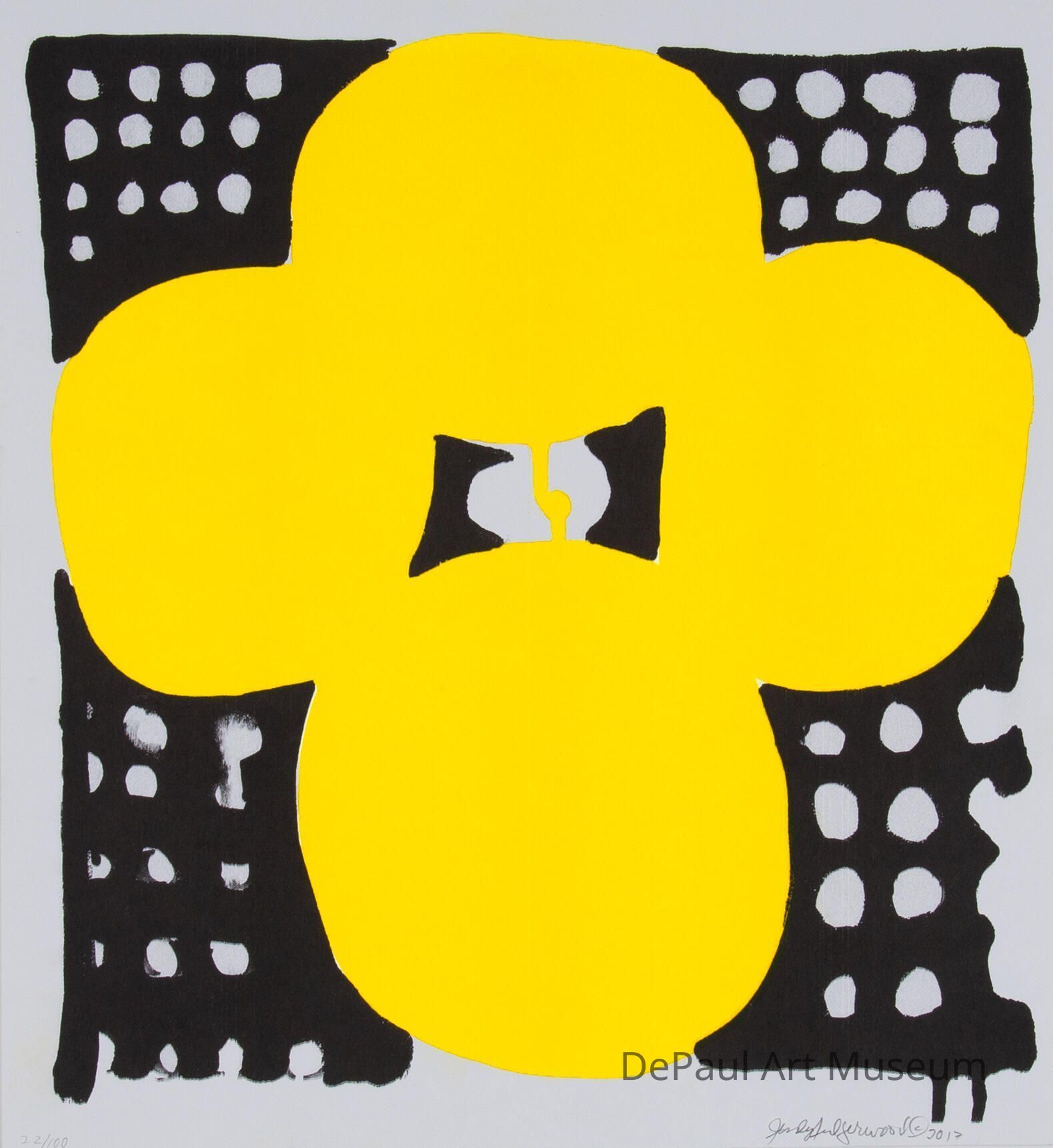 Large 4-petaled yellow flower with 4 areas around it being black with white polka-dots.