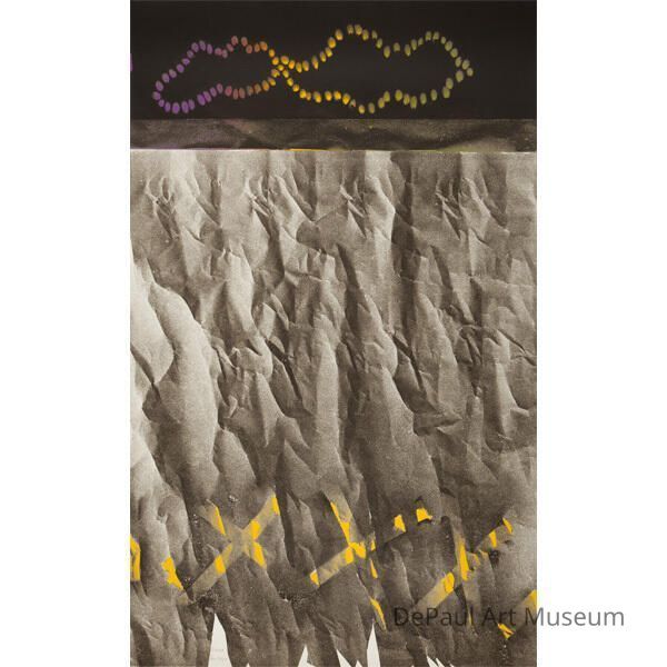 Grainy, grayscale crumpled paper texture with faded series of yellow "X"s along bottom and black stripe with colored dots along top edgeAcquisition