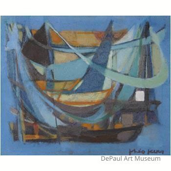 Multicolored curved lines, abstraction of ship with sails. Voiles Et Filets means "Sails and Nets" in French.