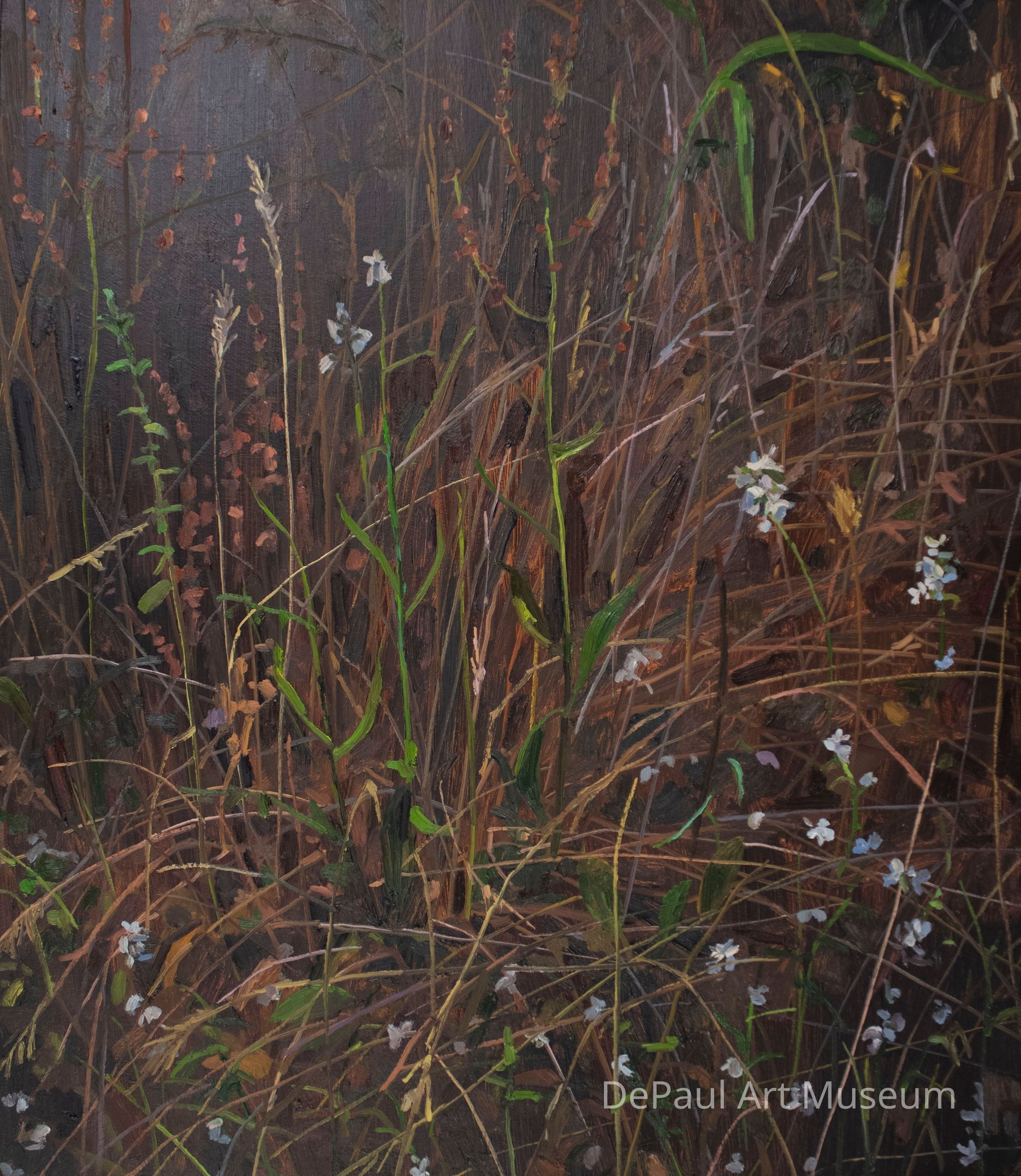 "This painting is part of an ongoing series of wildflower paintings that I started during Covid. The painting references a gradual passing of time while depicting a view looking down on a single area of ground. Wildflowers are resilient - existing both in forests and next to highways. They are often the first thing to grow back after a wildfire. There is an element of documenting and living with what is right in front of you in these paintings and they are derived from places that I know intimately. Their locations are intentionally ambiguous, moving from one place to the next without a sense of exact location." - Claire Sherman