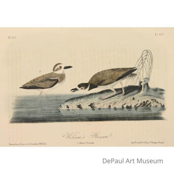 John J. Audubon’s (1785-1851) book ‘Birds of America’ was originally printed with “Double Elephant folio” engravings, meaning 435 life size images of North American birds. Between 1840 and 1869, several editions of a smaller (“octavo”) version of the book were printed. The prints found in DePaul’s collection are from this later era, and were printed by J.T. Bowen in Philadelphia. Bowen used a “camera lucida” to project the large engravings on lithographic stone which was then hand drawn and hand painted using watercolors. These smaller sized books made Audubon’s work accessible to a wider audience, and helped his art gain the reputation it still holds today.Acquisition