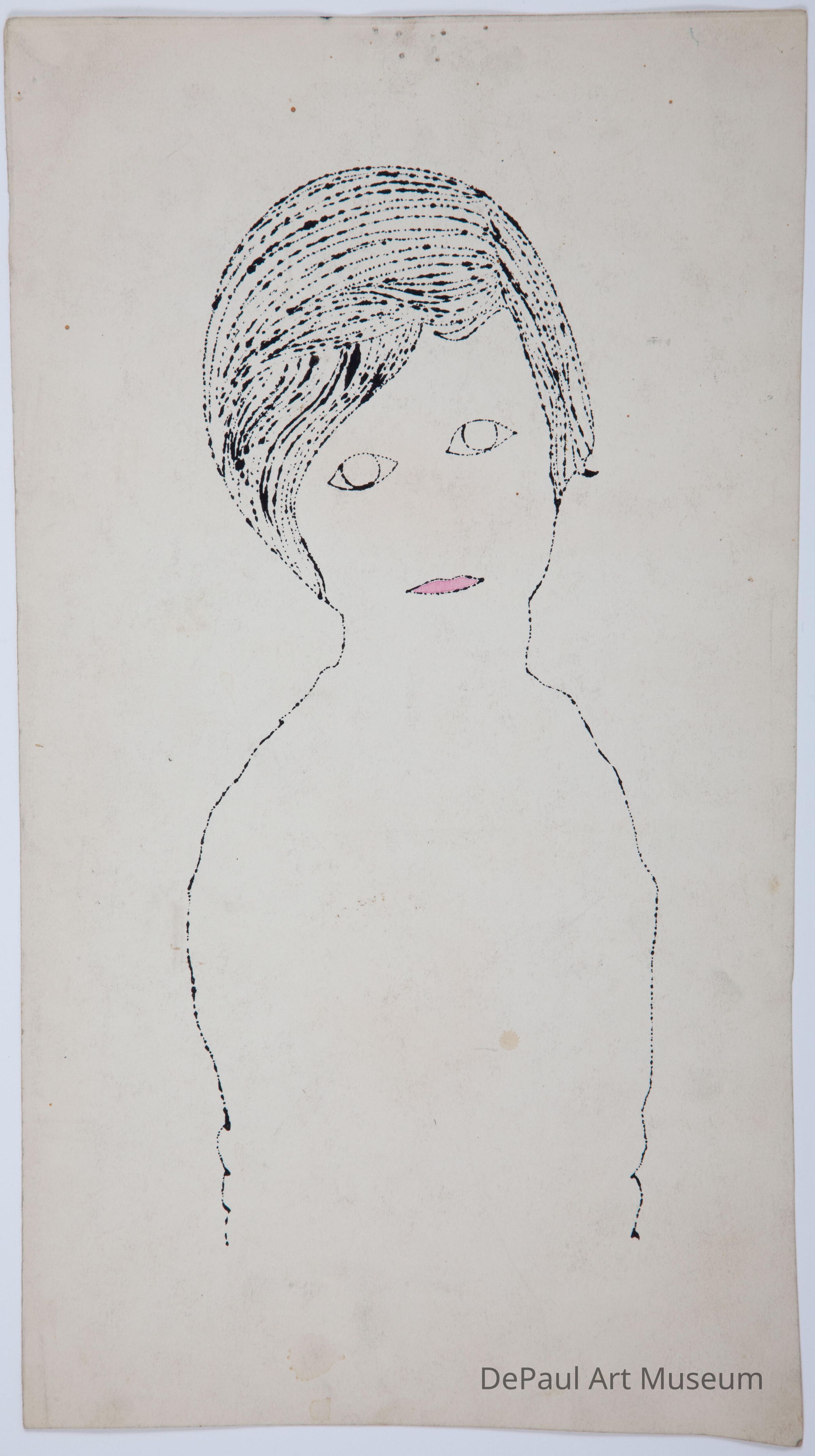 Bust of a female figure with short cropped hair. Her eyes are wide and she has a small pink mouth.Context