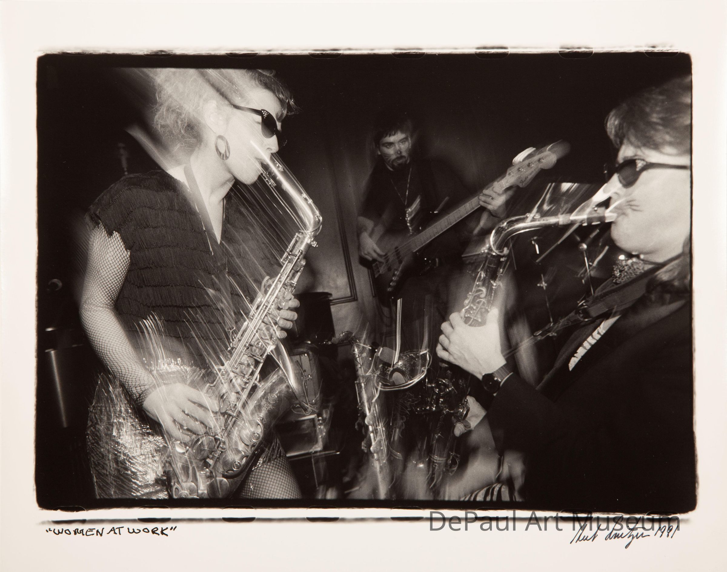 Two women in the forefront, playing saxophones. Both women wear sunglasses and are facing each other while they play. In the background is a man playing the bass guitar.