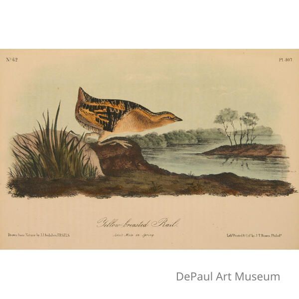 John J. Audubon’s (1785-1851) book ‘Birds of America’ was originally printed with “Double Elephant folio” engravings, meaning 435 life size images of North American birds. Between 1840 and 1869, several editions of a smaller (“octavo”) version of the book were printed. The prints found in DePaul’s collection are from this later era, and were printed by J.T. Bowen in Philadelphia. Bowen used a “camera lucida” to project the large engravings on lithographic stone which was then hand drawn and hand painted using watercolors. These smaller sized books made Audubon’s work accessible to a wider audience, and helped his art gain the reputation it still holds today.Acquisition